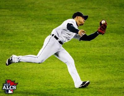 The ball hits in his glove and pops out, but he catches it in his bare hand before it hits the ground. The hitter is out, but the runner tagged up when the ball hit the glove and heads home.
