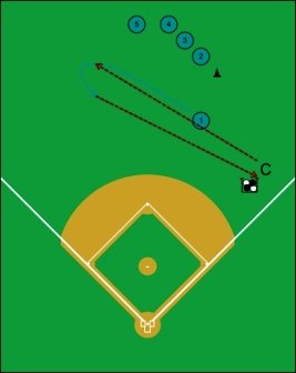 - Player then turns and runs, center diagram, as coach throws or hits a fly ball over the players head, for him to get behind and field, or catch on the run, executing a good crowhop, returning the ball to the coach.